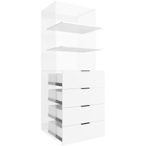 Our system, made up of 60 basic modules, offers endless configurations. With a selection of cabinets, drawers, shelves, and hinged doors of various sizes, the possibilities for creating your personalized storage haven are boundless.